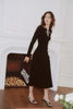A sculptural elegance defines the Alvira Knit Dress. The clean silhouette is elevated by a delicate petal motif at the neckline, creating a focal point that flatters the décolletage with quiet sophistication. White contrast trim brightens the collar, bringing subtle freshness against the deep body tone, while the fine knit structure ensures a smooth, figure-enhancing drape. Designed to transition effortlessly from intimate evenings to polished daytime wear, it embodies timeless refinement with a modern edge.