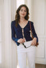 Midnight navy silk is scattered with playful white polka dots, blending French elegance with a touch of vintage charm. A deep V neckline, traced with delicate lace, enhances the décolletage with subtle femininity, while slender ties cascade down the front for a graceful, fluid finish. Gentle flared sleeves sculpt the arms with effortless romance, and the fluid drape of double-crepe silk moves with ease, making it as timeless as it is versatile.