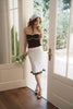 Playful yet elegant, the Lisa Knit Top combines feminine charm with modern allure. Crafted from a lightweight Tencel, cotton, and silk blend, the fabric feels soft and breathable with a natural stretch for all-day comfort. A delicate bow detail at the neckline brings a touch of sweetness, while the contrasting trim highlights the bustline with subtle sophistication. The halter-neck tie frames the collarbones, balancing softness with a refined edge—perfect for summer evenings or layered chic.