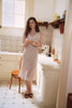 Playful French charm meets timeless elegance in this original croissant-inspired print, scattered with whimsical motifs across fluid silk. A scalloped lace trim frames the plunging V-neckline and shoulders, lending an air of delicate romance. The back mirrors the design with a soft V-cut, subtly revealing the neckline and enhancing feminine allure. Bias-cut tailoring lets the silk drape with natural ease, creating a graceful wave-like flow with every movement—perfect for mornings at home or sunlit strolls abroad.