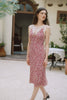 A cascade of vivid pink roses blooms across lustrous silk, their intensity softened by the fluid drape of the fabric. Scalloped lace traces the plunging V-neckline and armholes, infusing the dress with delicate elegance. The back mirrors this detail with a flattering V-cut, subtly baring the nape and shoulders for an added touch of allure. Bias-cut construction allows the skirt to fall in natural waves, moving with ease and grace - an ode to timeless femininity and romantic poise.